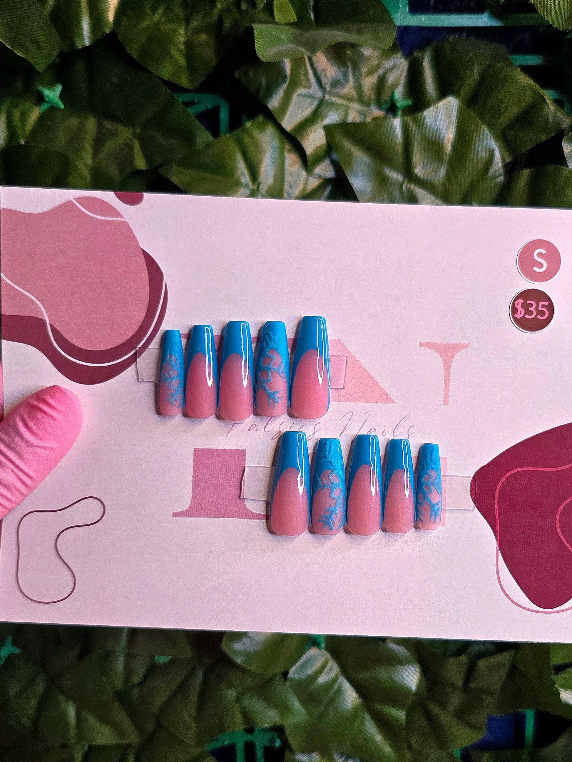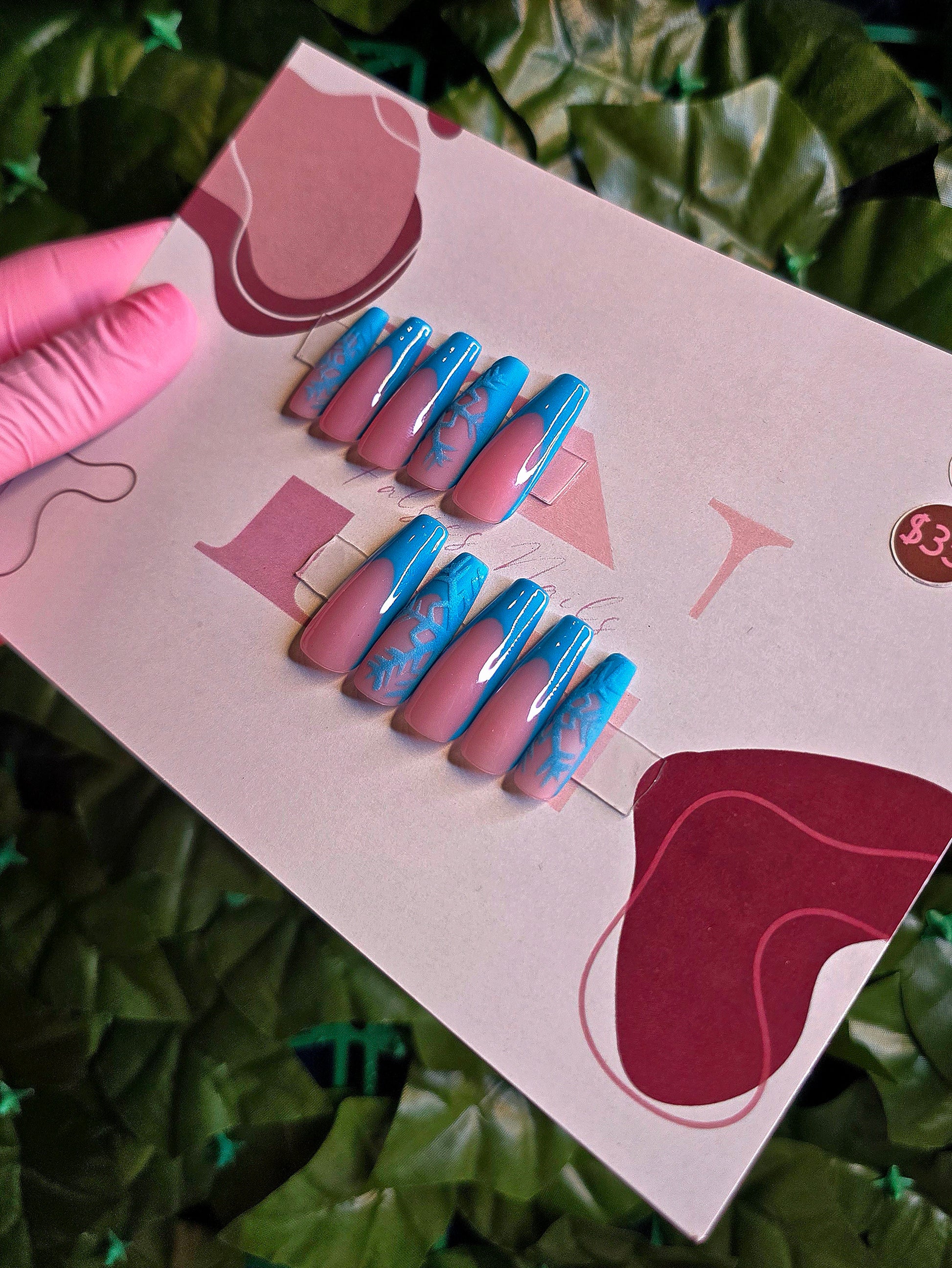 Cool, crisp, and effortlessly elevated. Frozen French puts a winterized twist on the classic French silhouette, blending a soft nude base with bold icy-blue tips and delicate snowflake detailing. This set is built for the girl who wants seasonal glam without losing her clean-girl edge — polished, modern, and intentionally eye-catching.